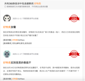 这些品控问题并非孤例。在“黑猫投诉 【下载黑猫投诉客户端】”上搜索“好特卖”,结果显示大量与产品质量相关的投诉。有消费者称购买到“已变质的零食”,并附上照片证据;还有用户投诉“饮料内有异物”,申请退款却遭遇推诿;更有不少投诉指向“临期商品未显著标注”,导致消费者在不知情的情况下购入即将过期的食品。